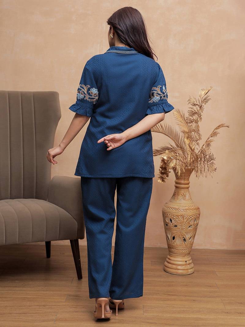 | Product Description | Elegant Blue Co Ord Set In Breathable Cotton With Beautiful Embroidery In White, Blue, And Brown. Designed For Festive Or Casual Chic Occasions. |