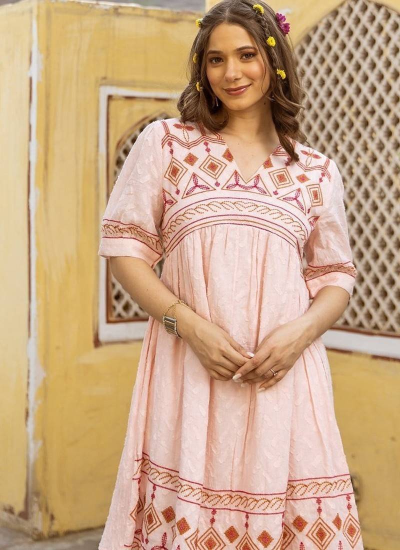| Product Description | Soft Breathable Pink Dress With Rich Dark Pink And Rust Embroidery Offering Tonal Contrast. Ideal For Casual Outings And Festive Occasions. |