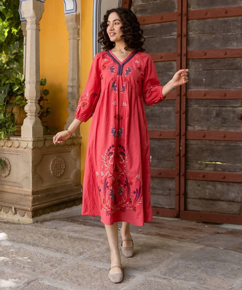 | Product Description | This Striking Red Dress Is Detailed With White, Blue, And Green Embroidery, Creating A Vibrant Contrast With The Rich Red Base. Designed With A Flattering V Neckline, It Blends Traditional Charm With A Modern Silhouette. Perfect For Festive Occasions Or Special Gatherings, Offering A Graceful Balance Of Bold Colour And Intricate Handwork. |