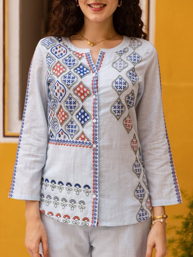 Sky blue embroidered cotton co-ord set