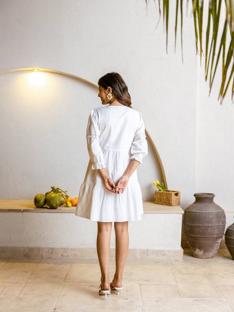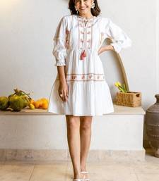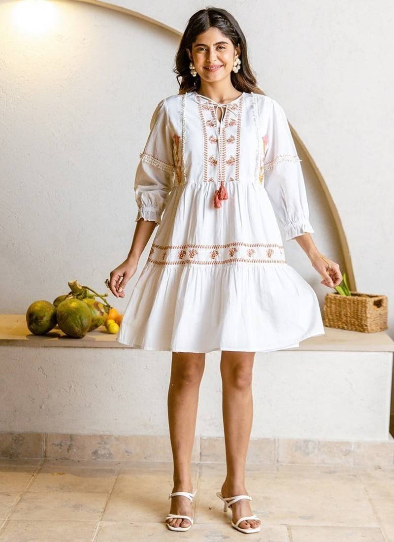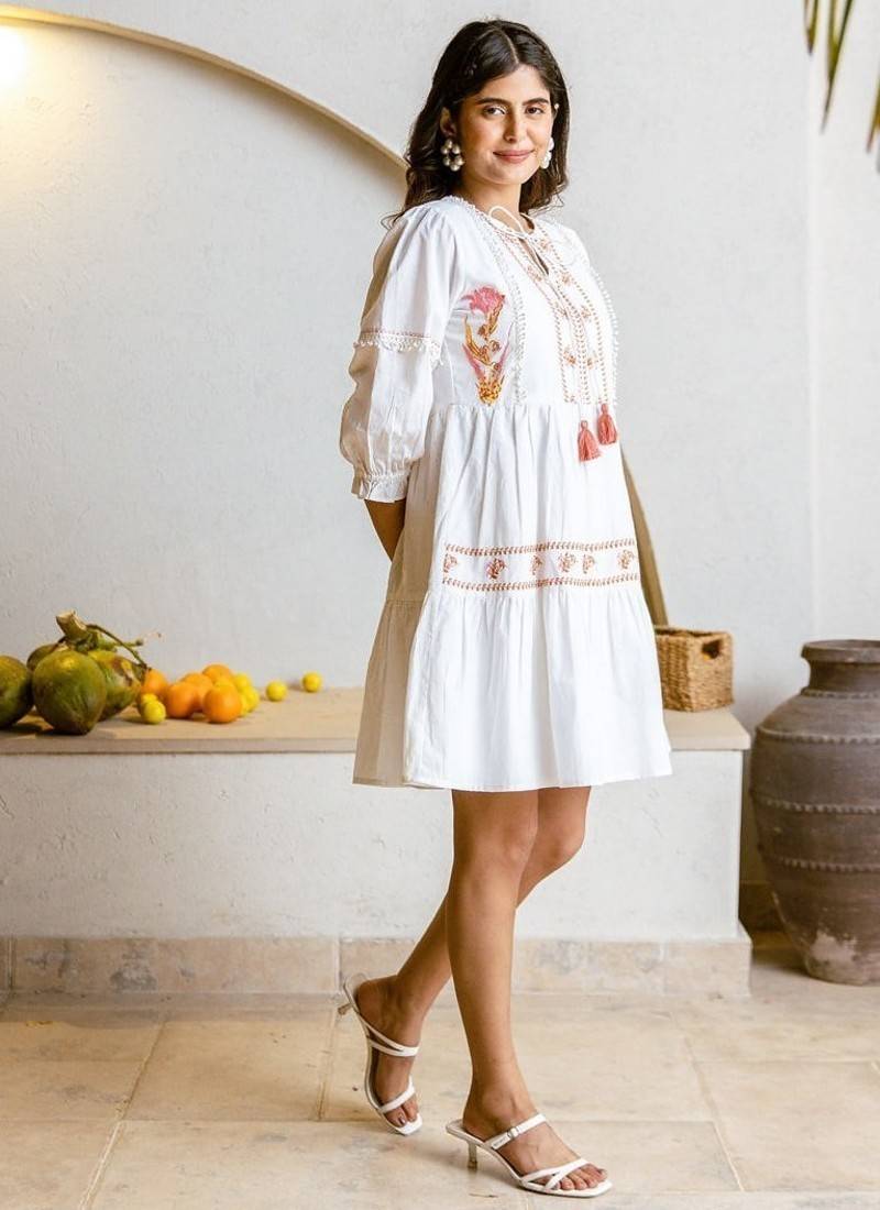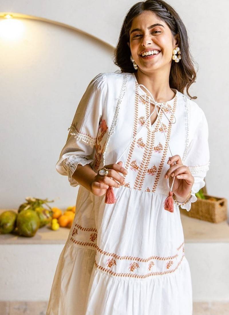 | Product Description | White Cotton Midi Dress With Intricate Machine Embroidery In Warm Rust, Sunny Yellow, And Soft Pink Tones. Comfortable And Stylish For Relaxed Summer Elegance And Daywear. |