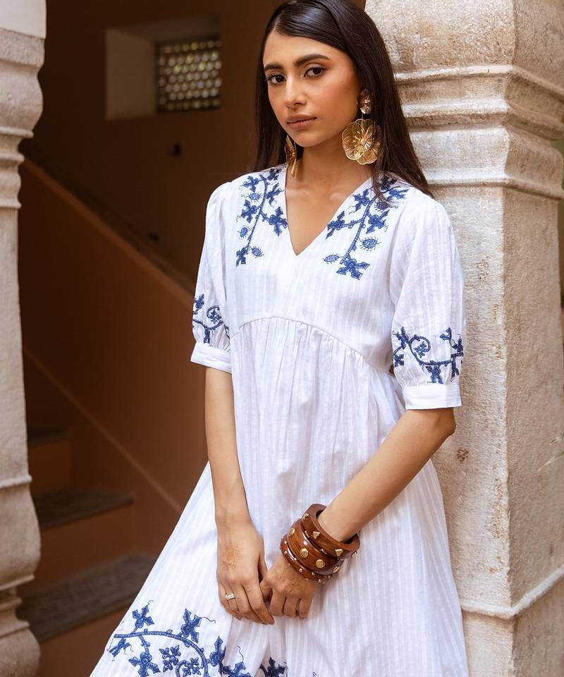| Product Description | White Dress With Delicate Blue Embroidery, Crafted In Breathable Cotton Dobby Fabric Known For Textured Geometric Patterns, Lightweight And Comfortable. |