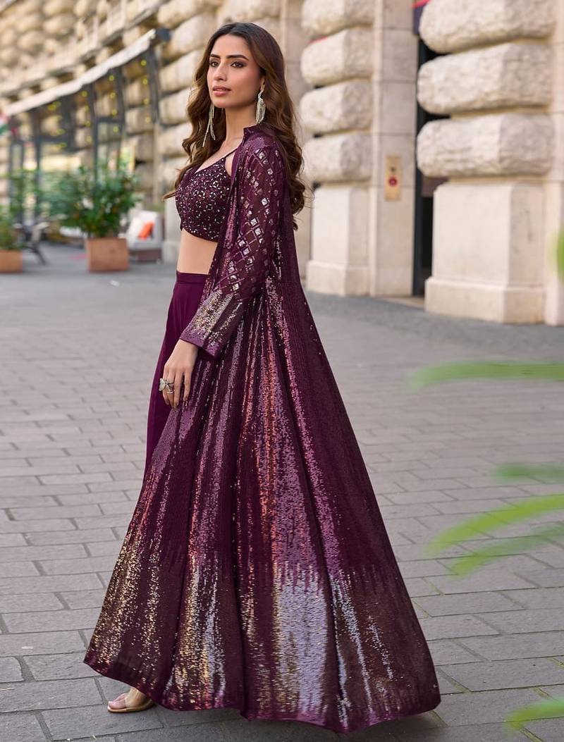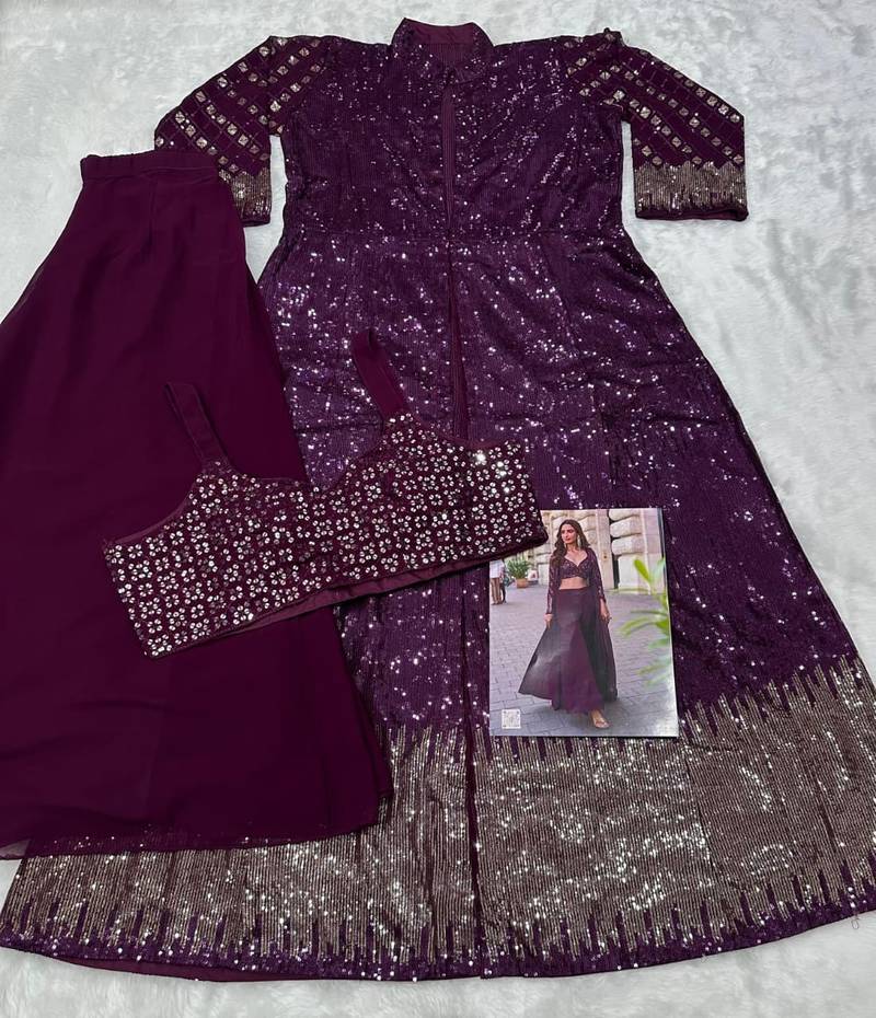 Purple heavy georgette indowestern crop top palazzo shrug set-full stitched free size