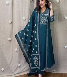 Blue floral embroidered v neck pure cotton kurta trouser dupatta set