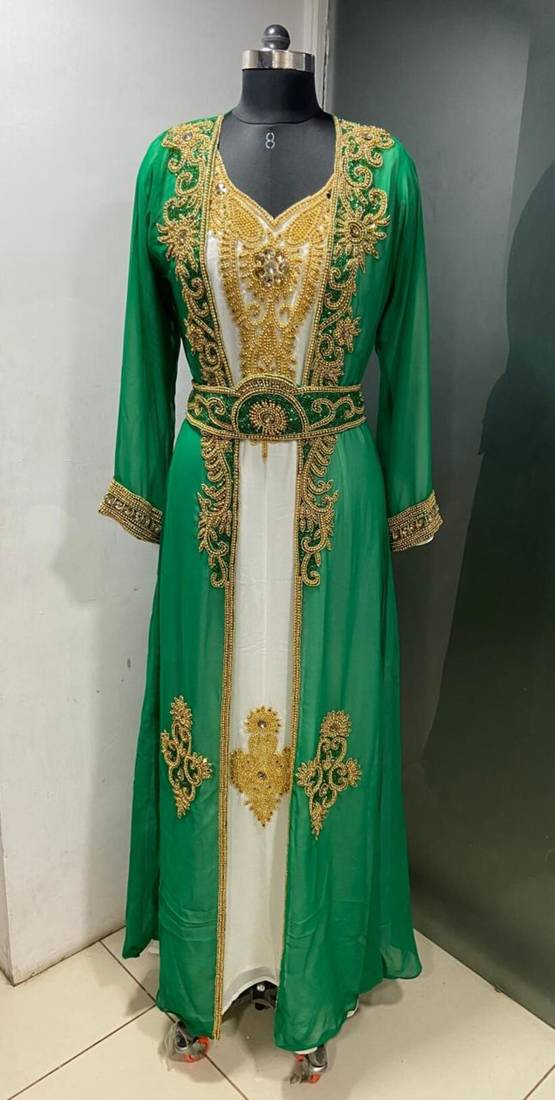 | Product Description | This Is Jacket Style Moroccan Takchita Kaftan With Gold Stones Work. Inner Dress Comes In White And Jacket In Green Colour |
