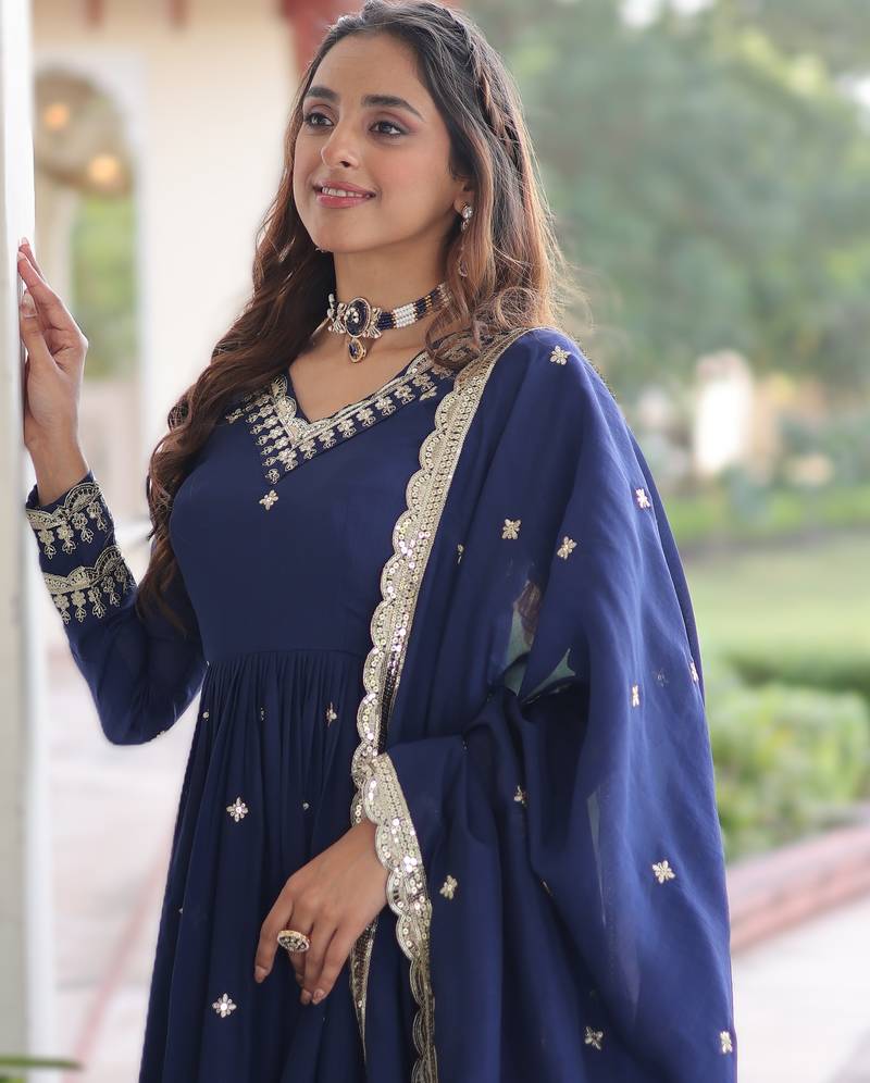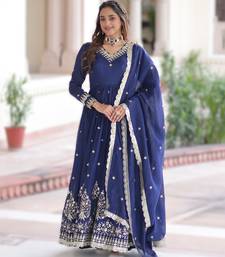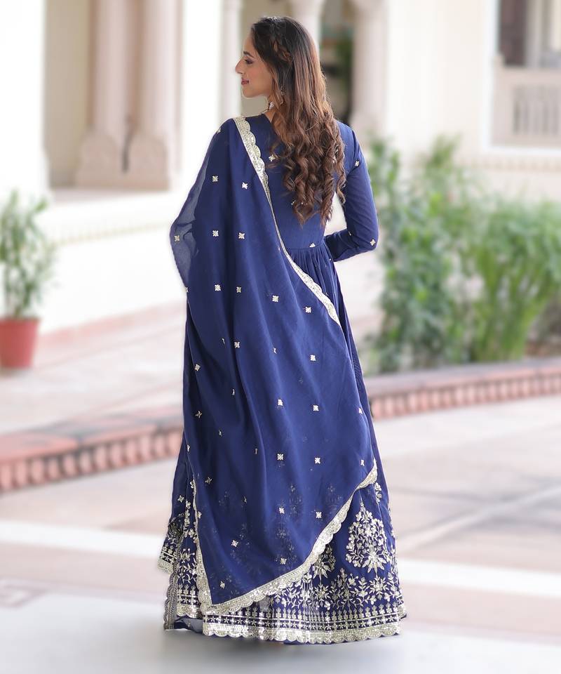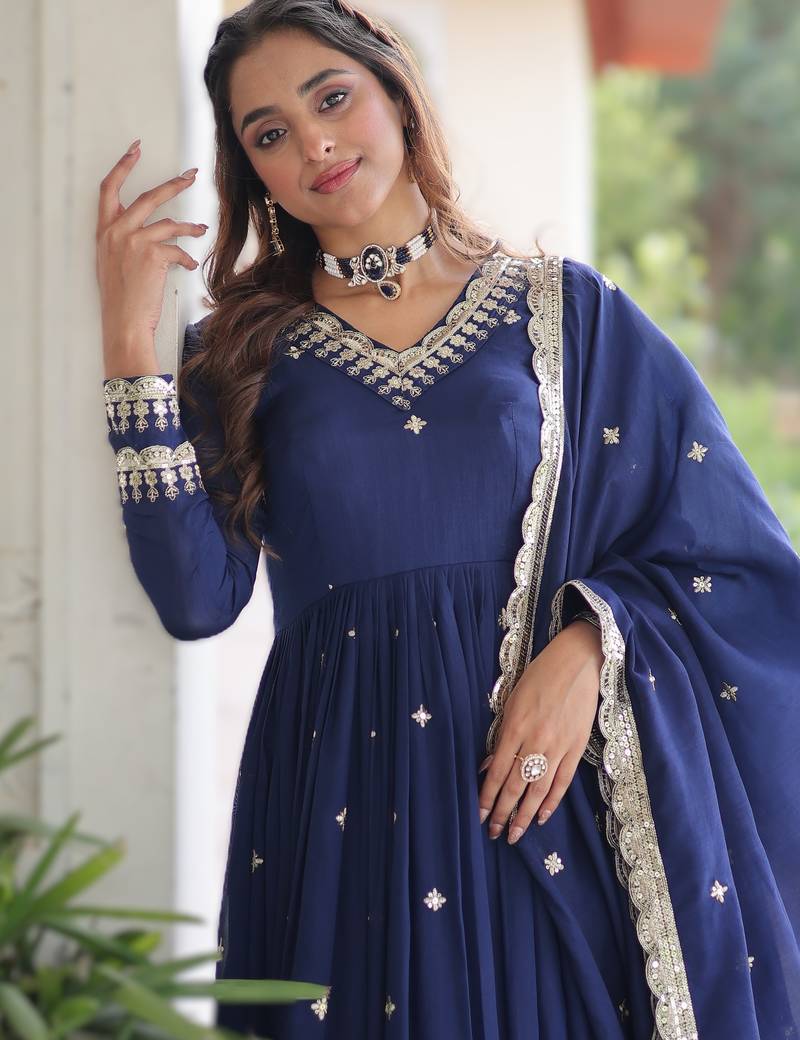 | Product Name | Blue Vichitra Silk Sequins Embroidered Gown With Dupatta – Fancy V Neck, Full Sleeves (Sizes 38–44) | |