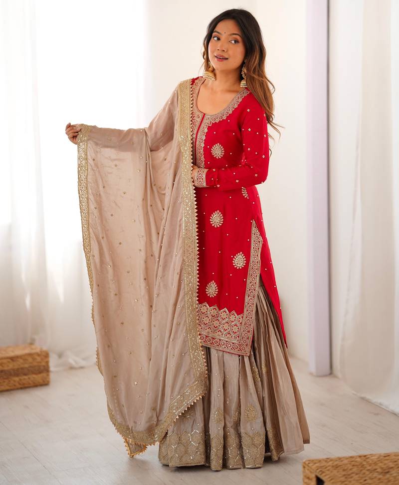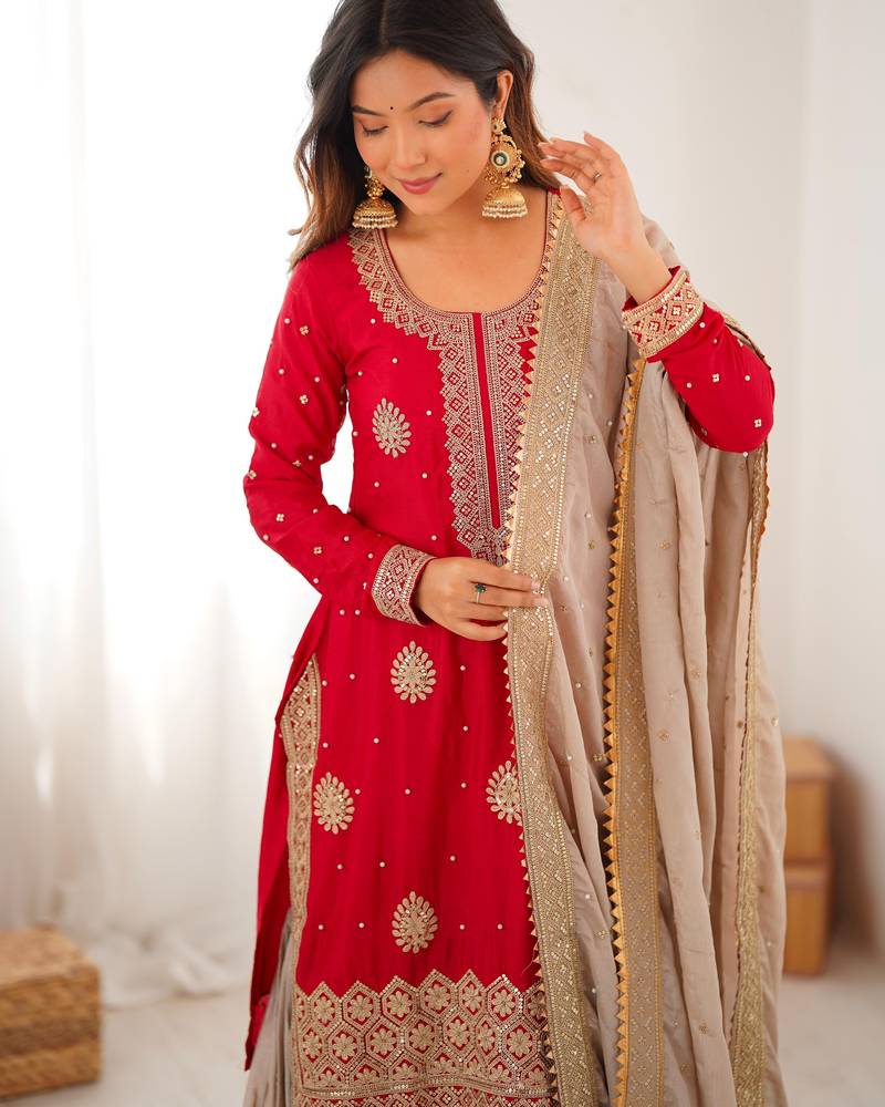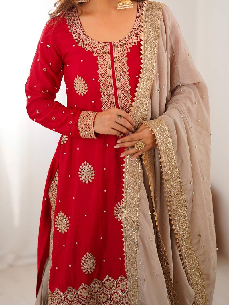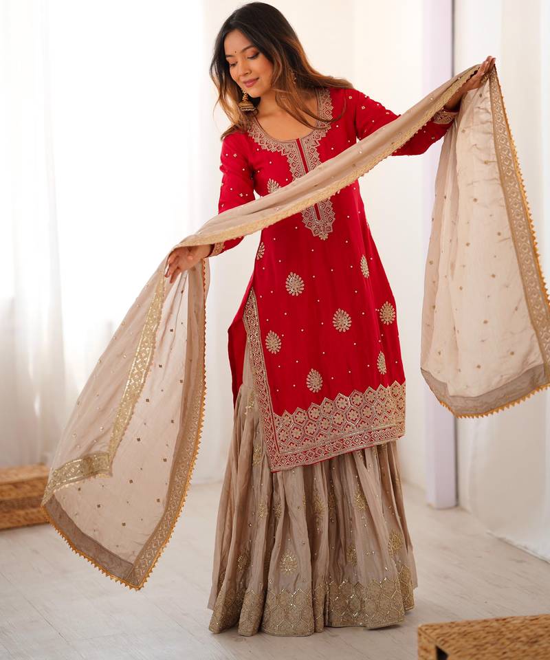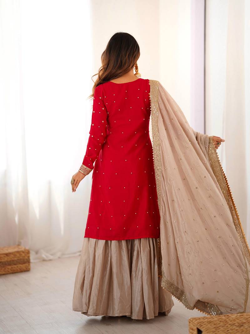 | Product Name | Chinon Silk Coding & Sequins Work Sharara Set With Pearl Detailing – Readymade Top, Sharara & Dupatta | |