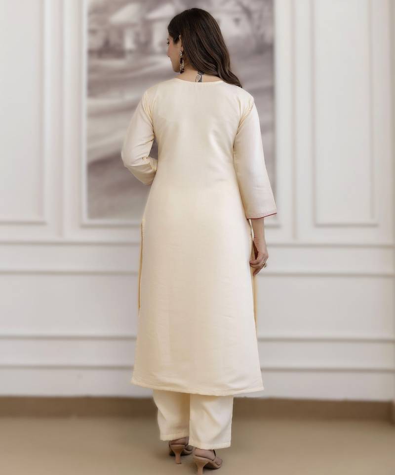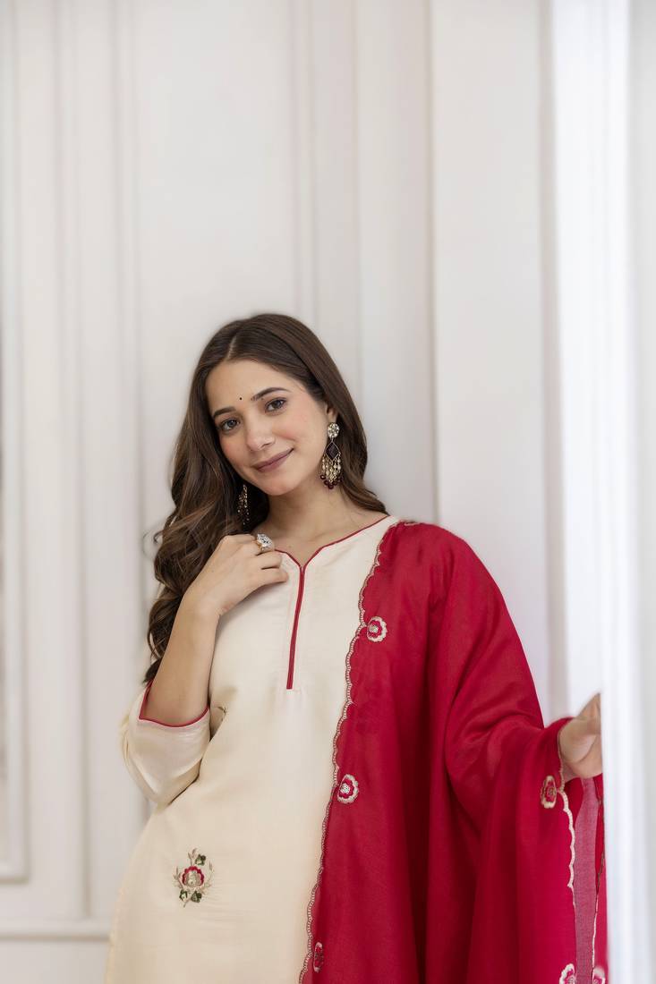Cream embroidered chanderi round neck kurta pant & dupatta stitched