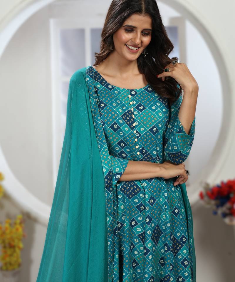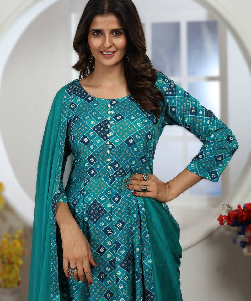 | Product Name | Dark Blue Premium Chanderi & Riyon Export Quality Long Kurti Set With Heavy Najmin Dupatta | |