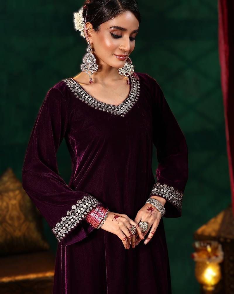 Dark wine velvet a-line kurta pant & dupatta stitched