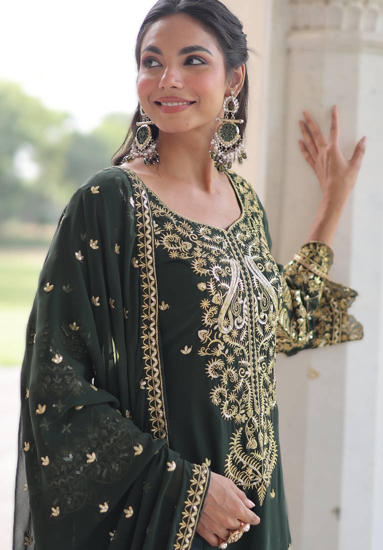 Green faux blooming embroidered kurti pant with dupatta stitched