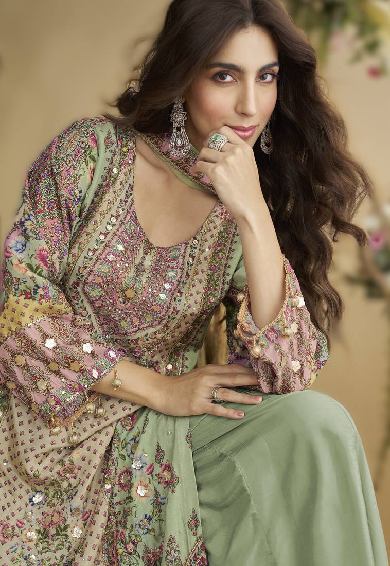 Parrot green crepe silk printed kurta palazzo set stitched