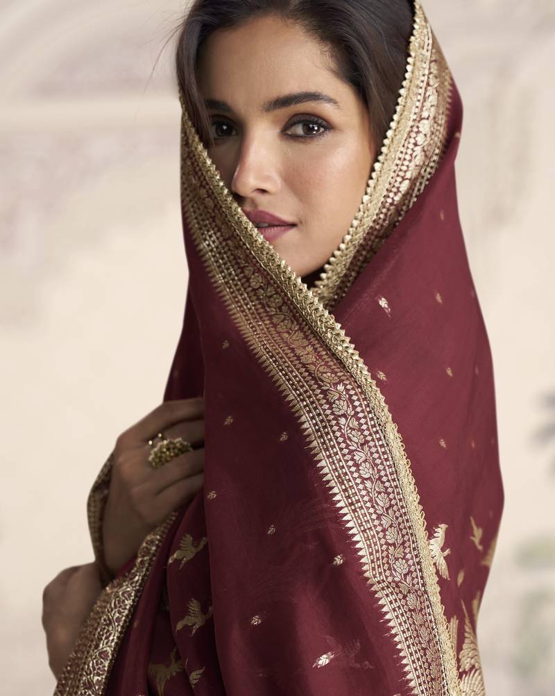 | • | Dupatta | : | Color- Maroon / Fabric- Silk Blend |