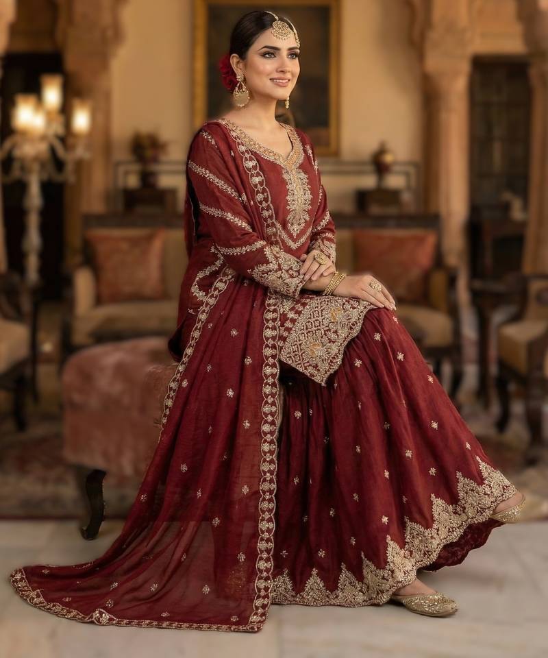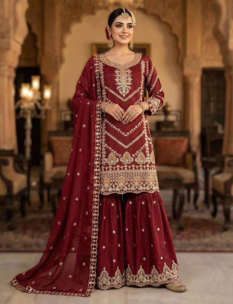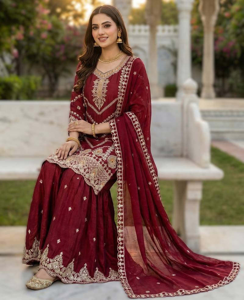 Maroon embroidered chinon sharara set stitched