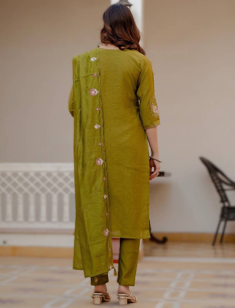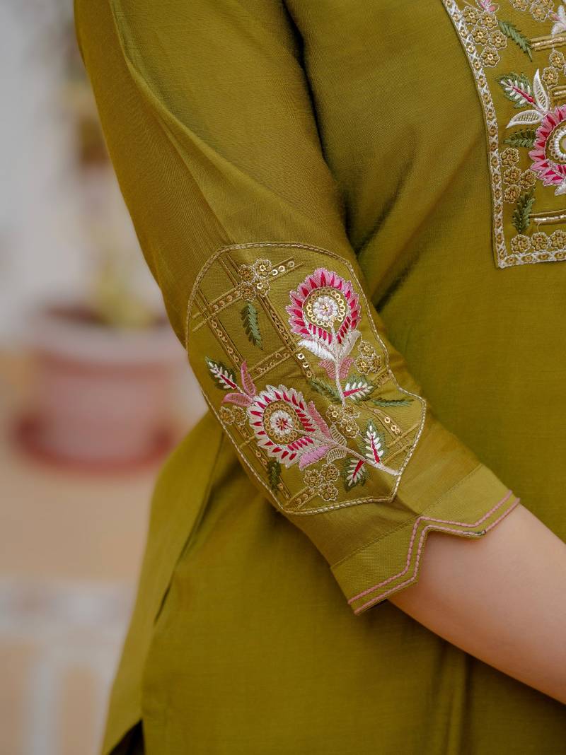 Mehendi green viscose mango silk embroidered & sequins work kurta set stitched