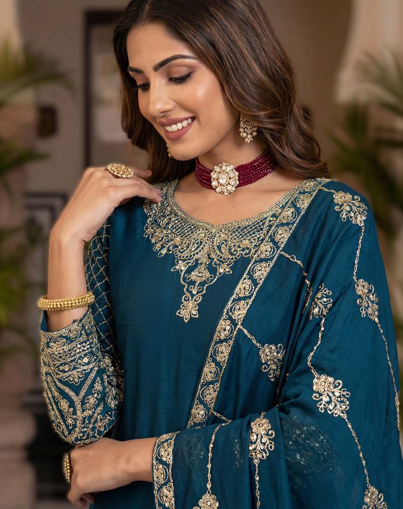 | • | Dupatta | : | Color- Navy Blue / Fabric- Silk Blend |