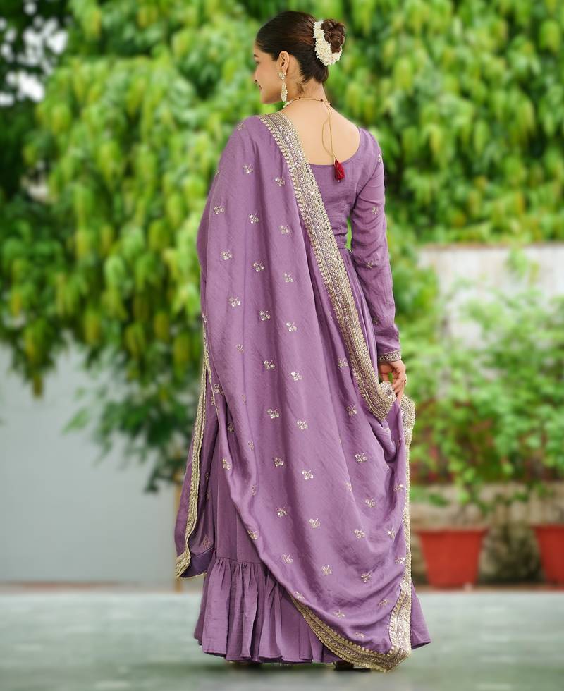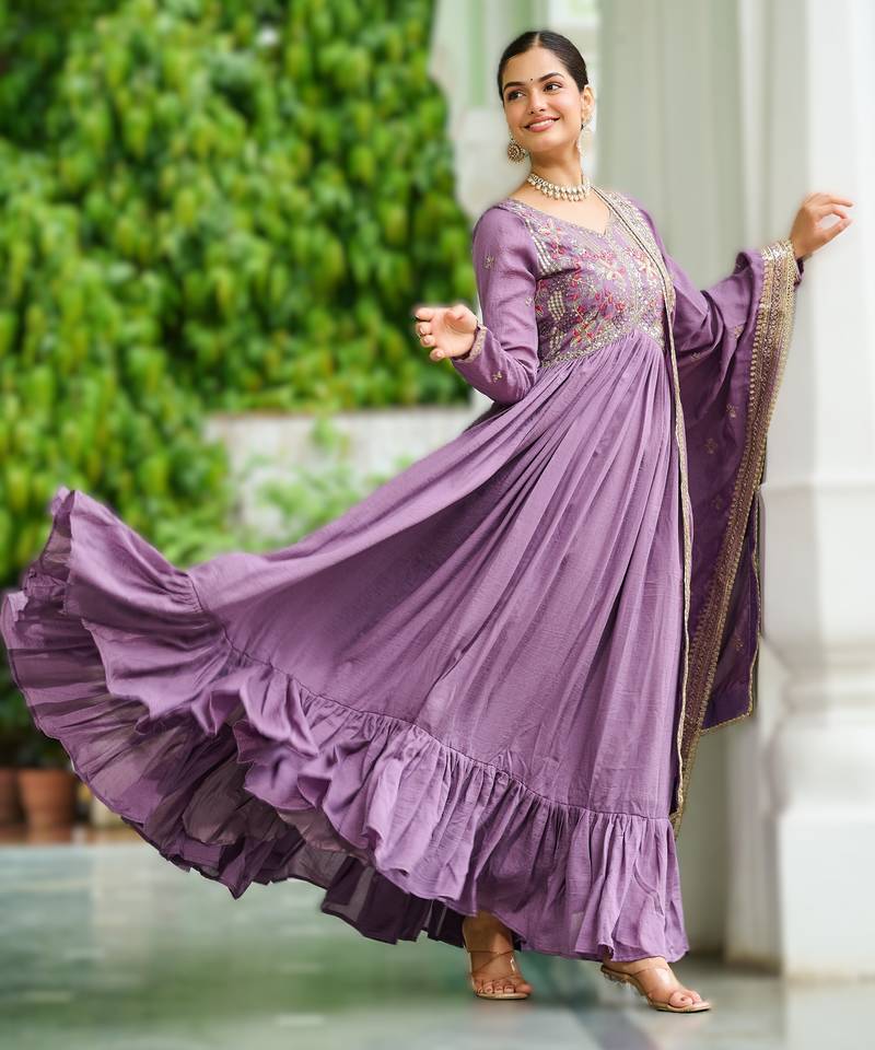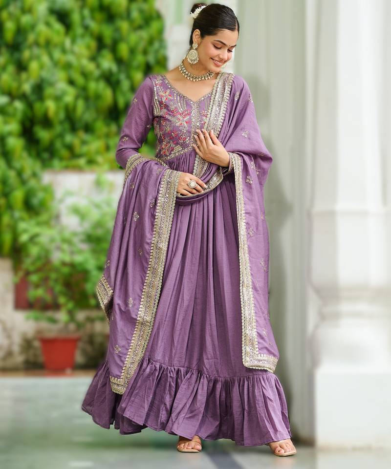 Onion vichitra silk embroidered anarkali gown with dupatta in pista green & lavender stitched