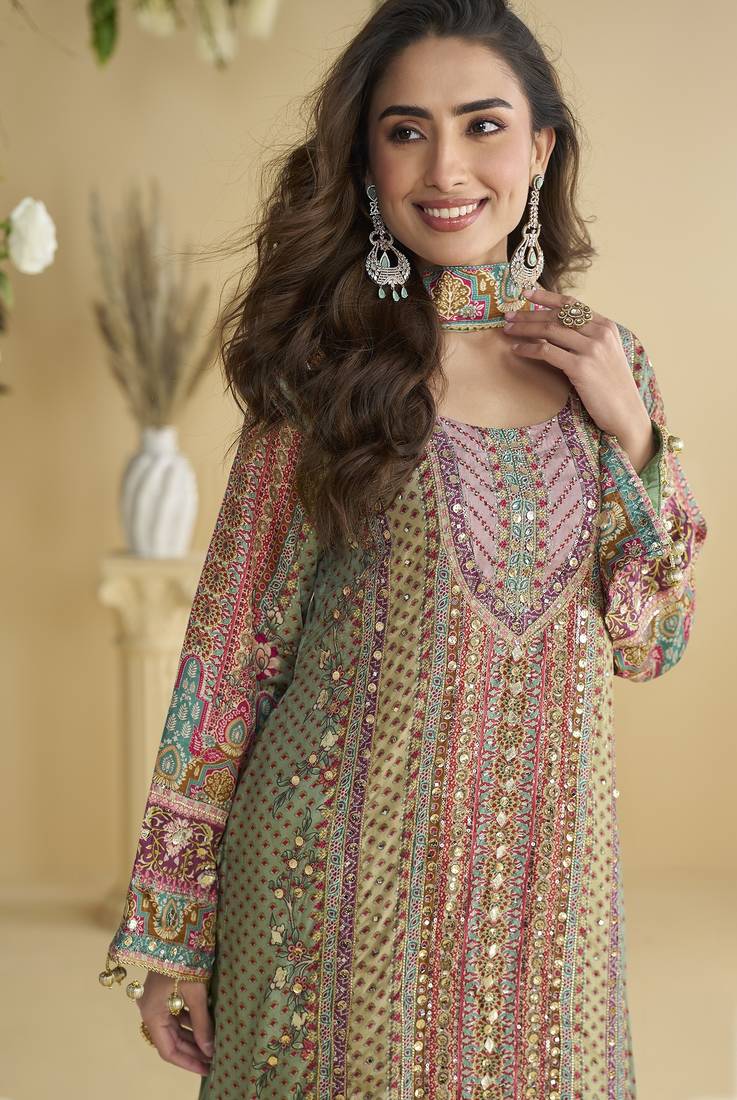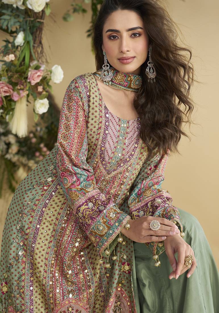Parrot green crepe silk printed kurta palazzo set stitched
