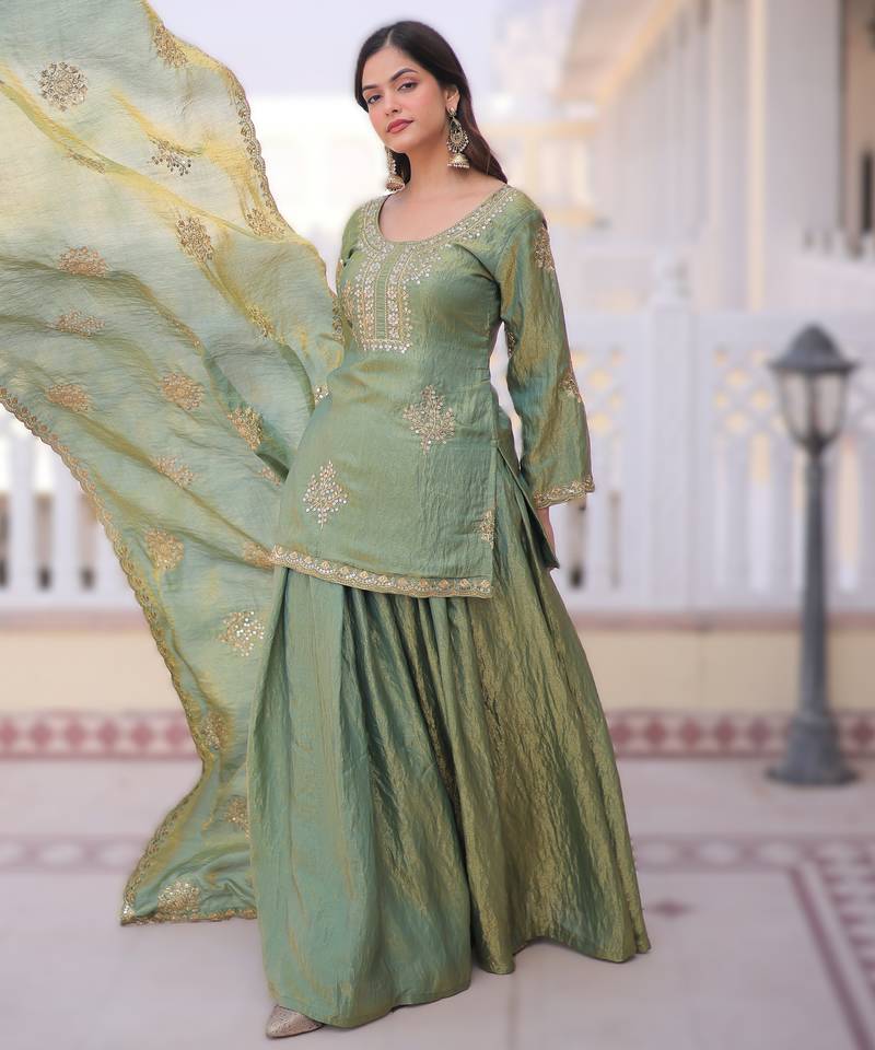 | Embellish | Upgrade Your Festive Wardrobe With This Beautifully Crafted Kurti Sharara Set, Made From Premium Fendi Crush Fabric | |