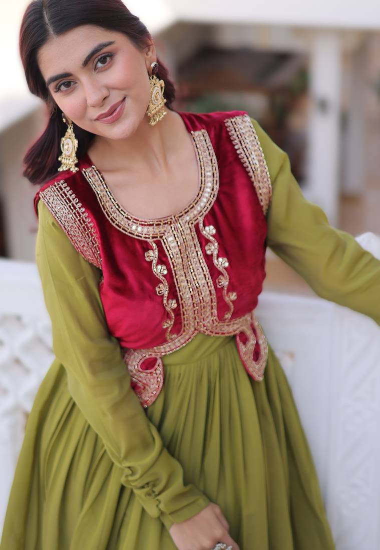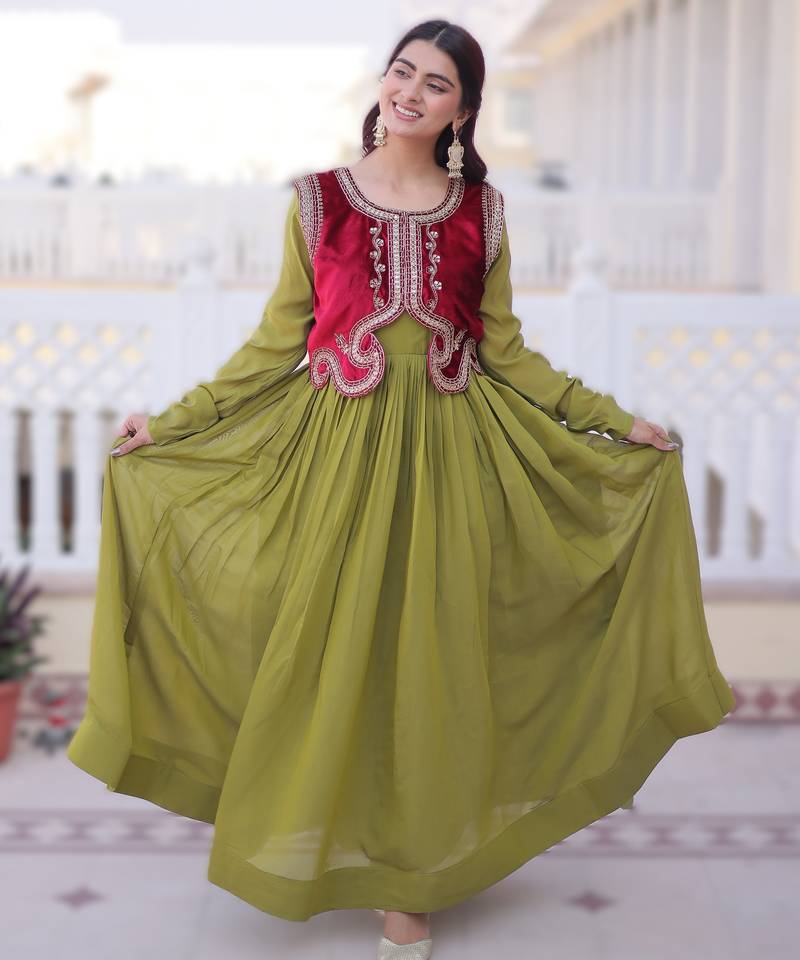 | Product Name | Parrot Green Embroidered Anarkali With Velvet Koti Set | |