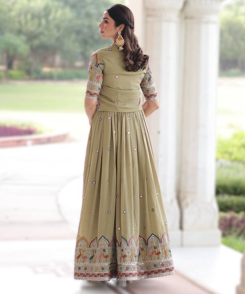 Parrot green vichitra silk embroidered anarkali with koti stitched