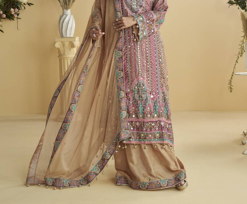 Pink crepe silk printed kurta palazzo set stitched