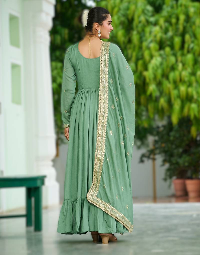 Pista green vichitra silk embroidered anarkali gown with dupatta in pista green & lavender stitched