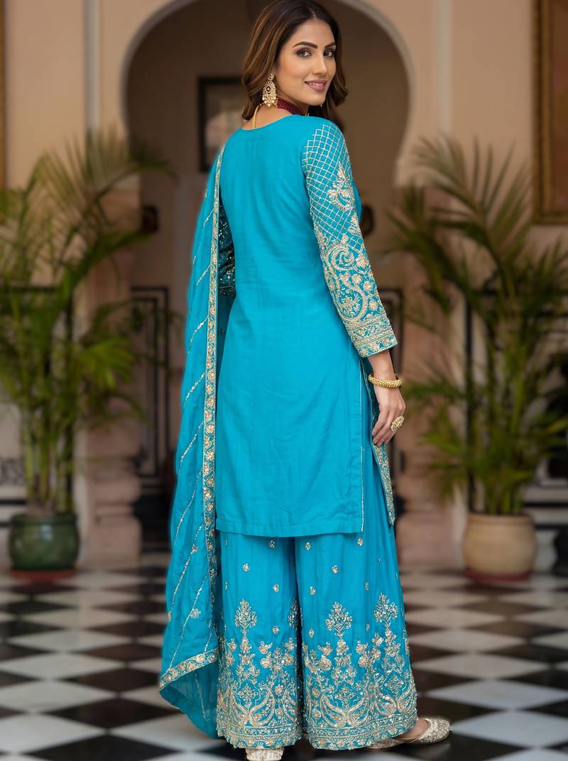 Sky bule embroidered sharara suit set stitched