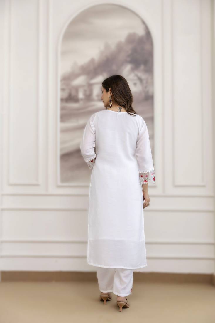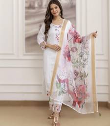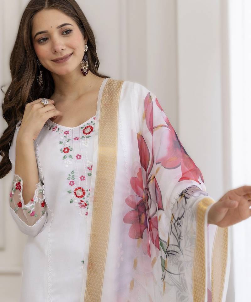 | Product Name | White Embroidered Chanderi Kurti Digital Print Organza Jacquard Dupatta | |