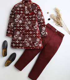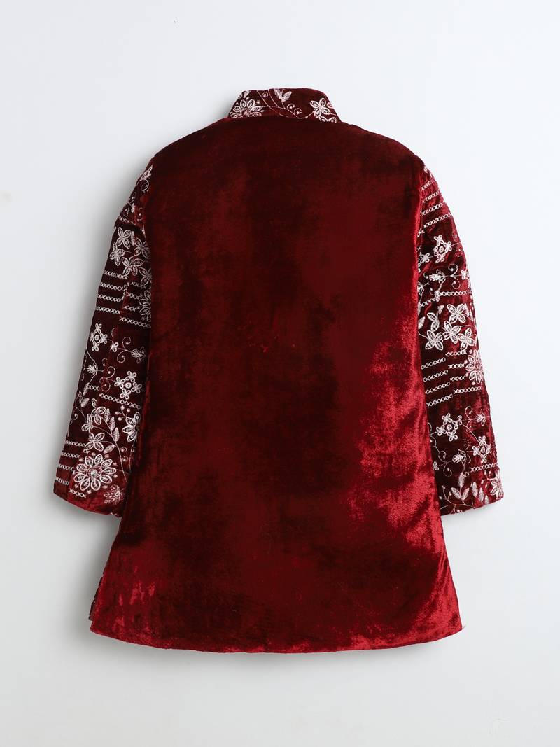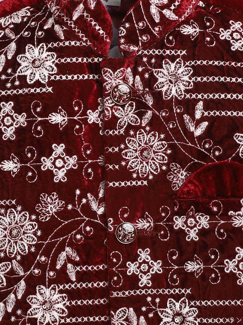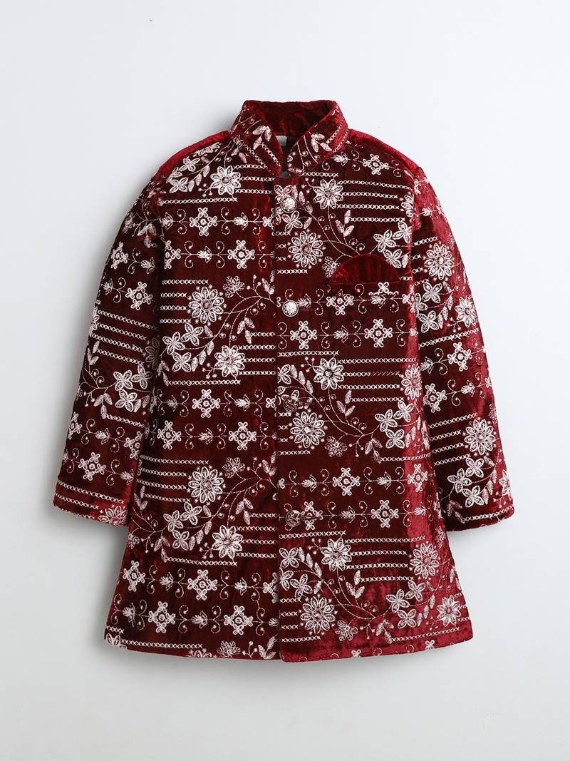 | Product Name | Boys Maroon Velvet Floral Vine Embroidered Sherwani & Trousers Set With Necklace | |