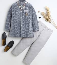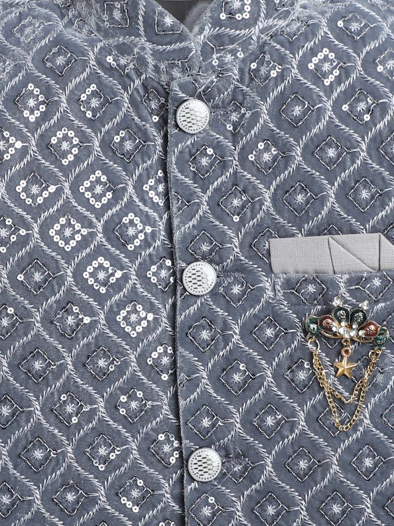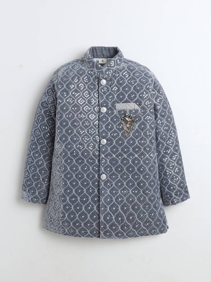 Boys silver grey velvet diamond motifs embroidered sequined sherwani & trousers set with necklace