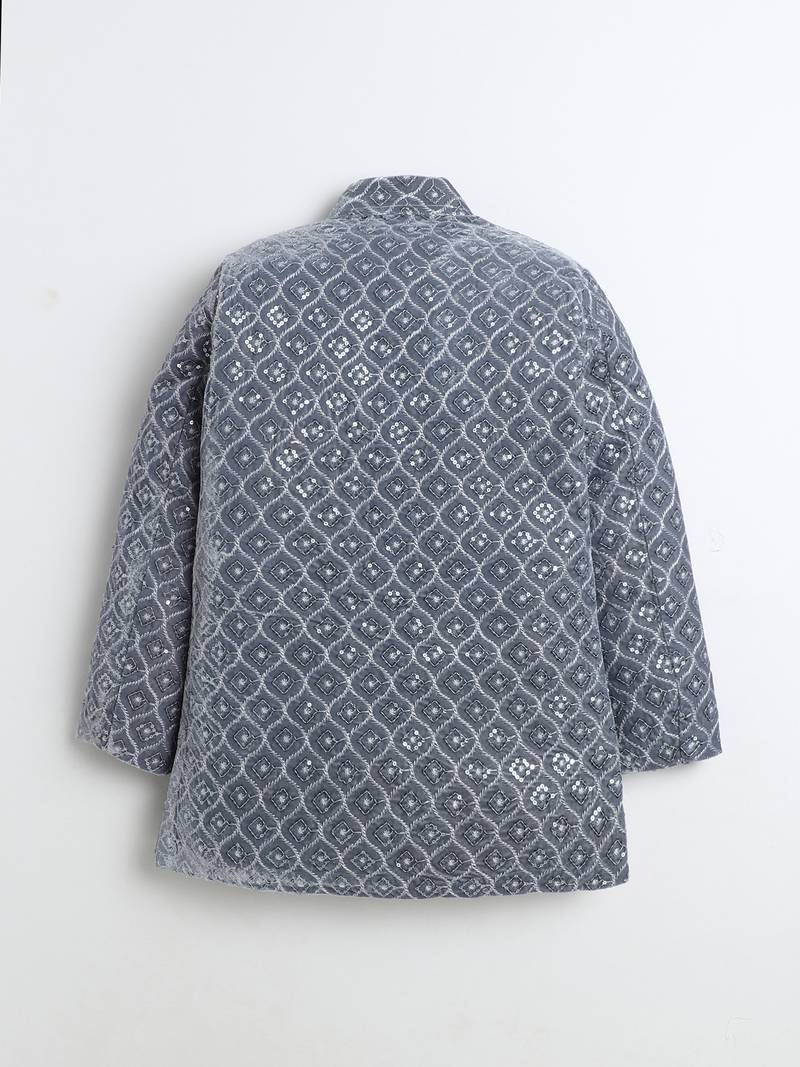 | Product Name | Boys Silver Grey Velvet Diamond Motifs Embroidered Sequined Sherwani & Trousers Set With Necklace | |