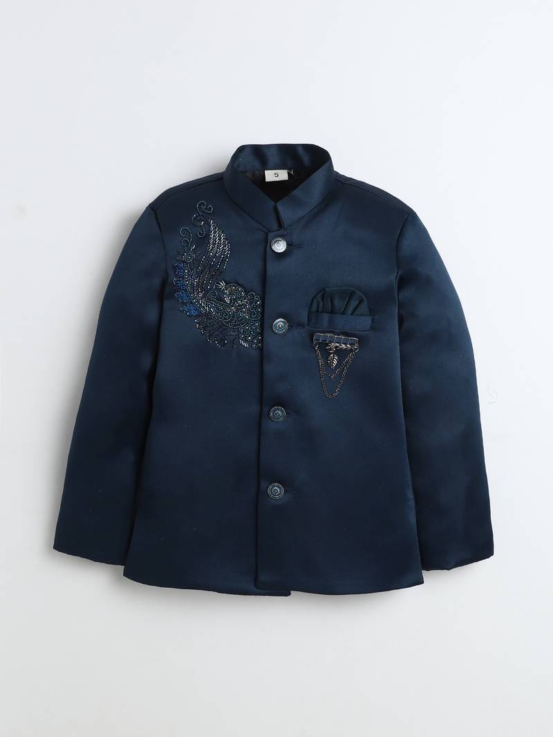 | Product Name | Boys Teal Blue Satin Peacock Sugar Beads Embellished Bandhgala Suit Set | |