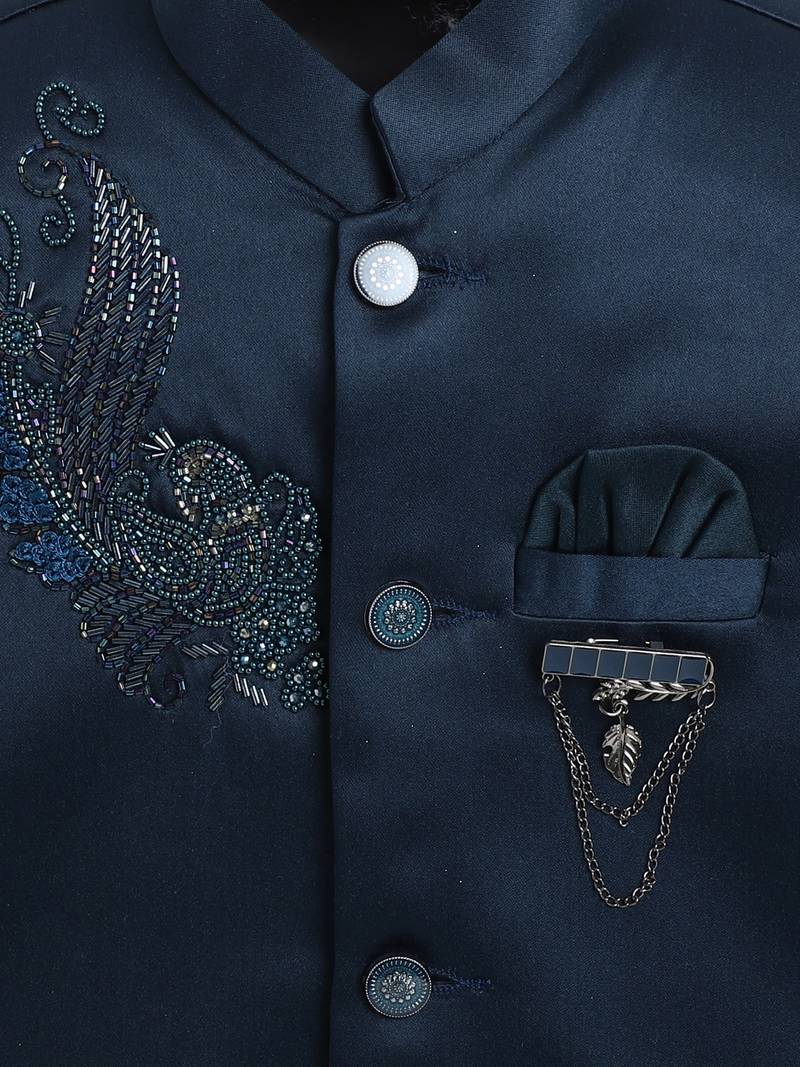 Boys teal blue satin peacock sugar beads embellished bandhgala suit set