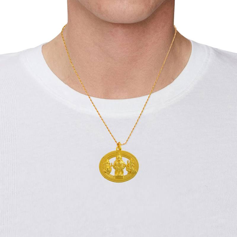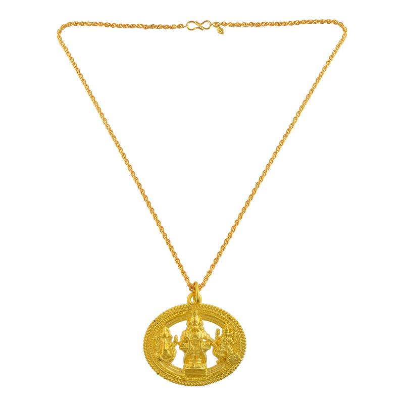 | Product Description | Designed In A Traditional Oval Motif, This Pendant Showcases Murugan At The Center, Flanked By Ganesh (The Remover Of Obstacles) And Lakshmi (The Goddess Of Wealth), Forming A Powerful Spiritual Trinity Revered In Hindu Mythology. Wearing This Pendant Is Believed To Harmonize The Energies Of Courage, Wisdom, And Abundance. Ideal For Daily Wear Or Festive Occasions, It Serves As A Sacred Talisman For Devotees Seeking Divine Guidance, Success, And Inner Peace. Crafted With Intricate Detailing And A Rope Style Chain, This Pendant Is More Than Jewelry—It’s A Spiritual Companion Rooted In Centuries Of Belief And Tradition. |