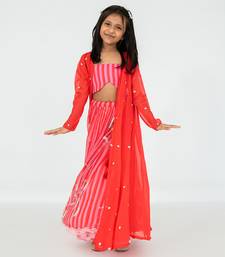 | Product Description | Striped Blouse Features Stylised Hem & Square Neckline. Comes With An Embroidered Lehenga And A Butti Embroidered Cape With Full Sleeves.