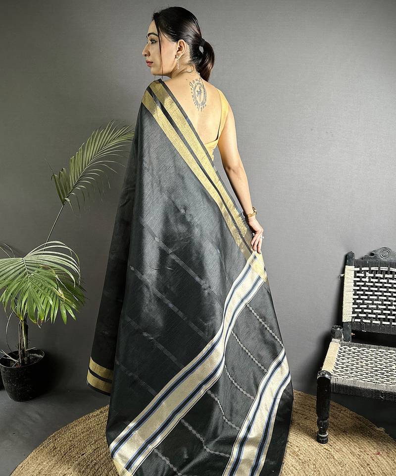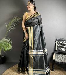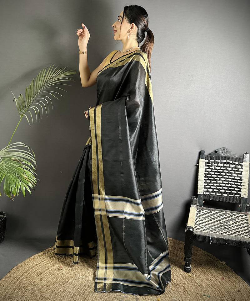 Black raw silk blend zari woven ghicha art saree