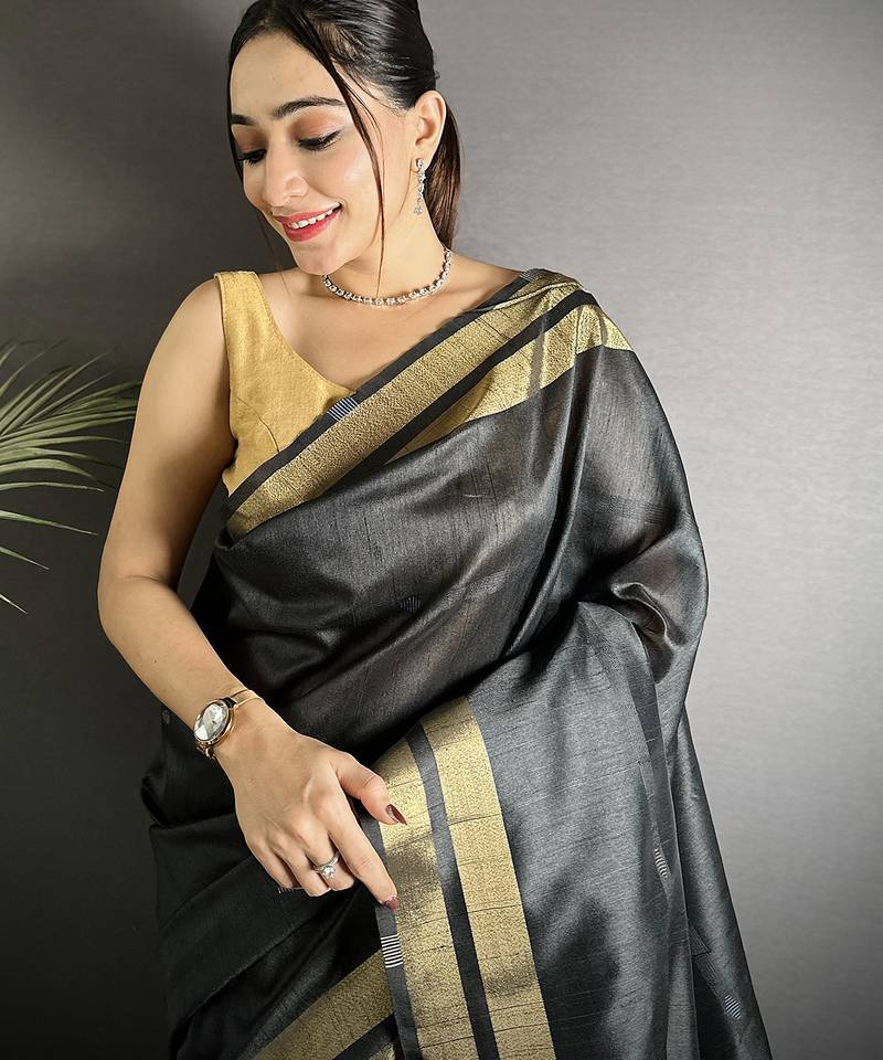 | Product Description | Embrace Elegance And Drama With The Black Raw Silk Zari Woven Ghicha Art Saree, A Showstopper In Women’s Ethnic Wear That’s Taking The Mirraw Trending Charts By Storm. The Deep Black Silk Provides A Rich Canvas For The Intricate Zari And Ghicha Artistry, Making It One Of The Most Popular And Top‑Ranking Choices For Festive Occasions, Weddings, And Celebrations. Its Luxurious Texture And Graceful Drape Make It A True Bestseller, Perfect For Women Who Love To Blend Tradition With Modern Style.