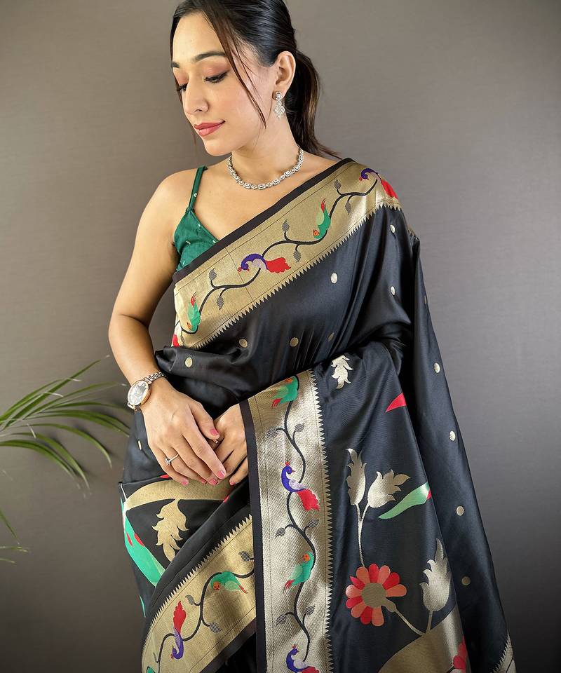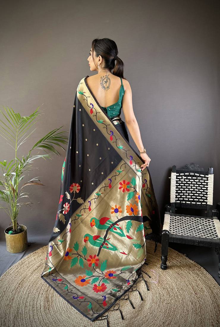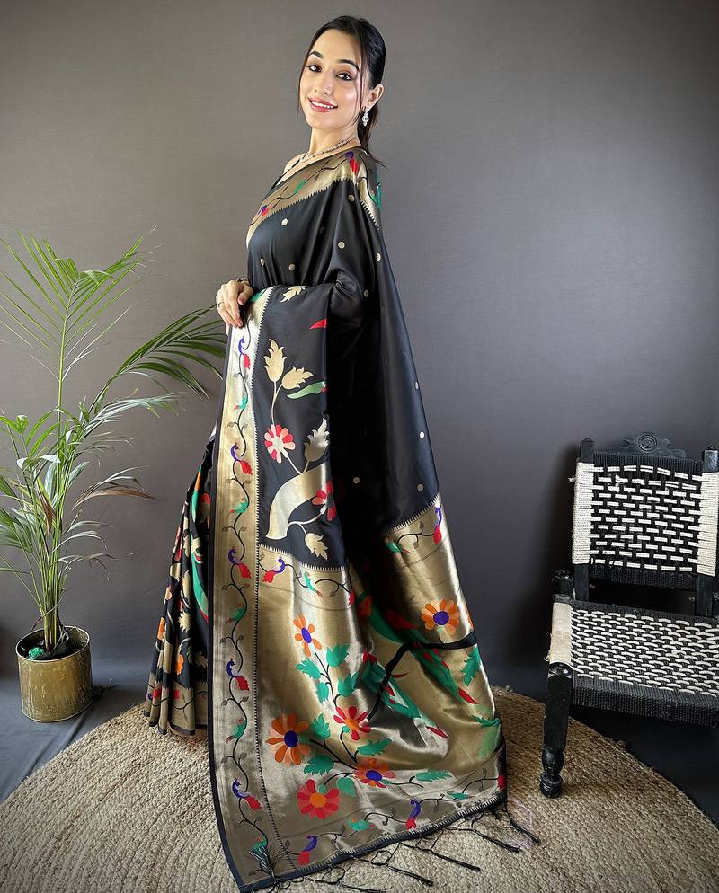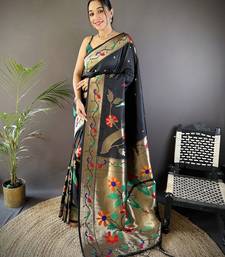 Black soft silk blend zari woven floral motifs paithani saree