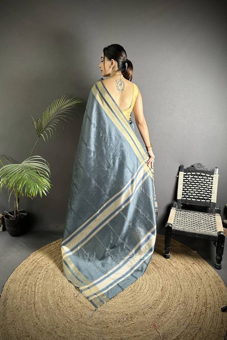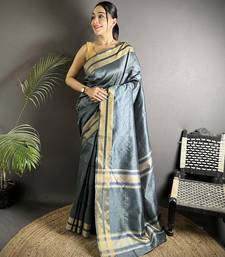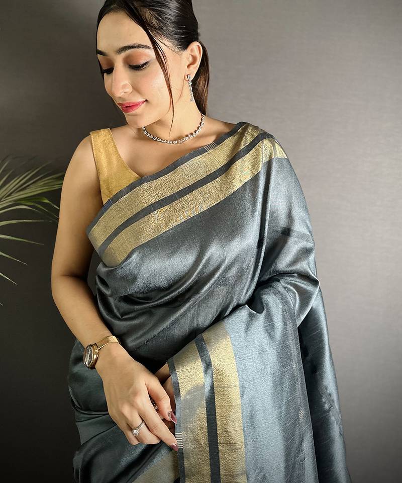 | Product Name | Dark Grey Raw Silk Blend Zari Woven Ghicha Art Saree | |