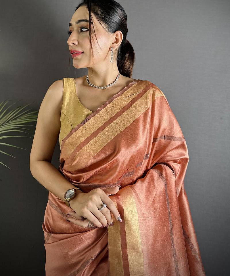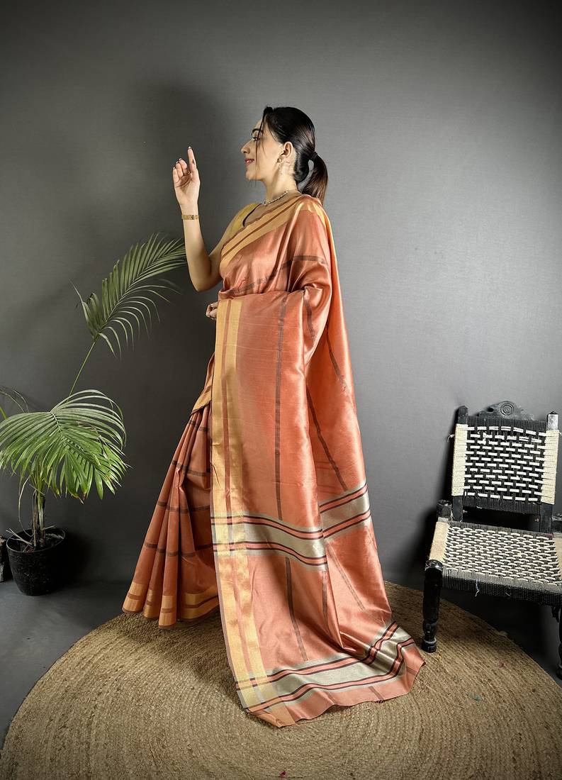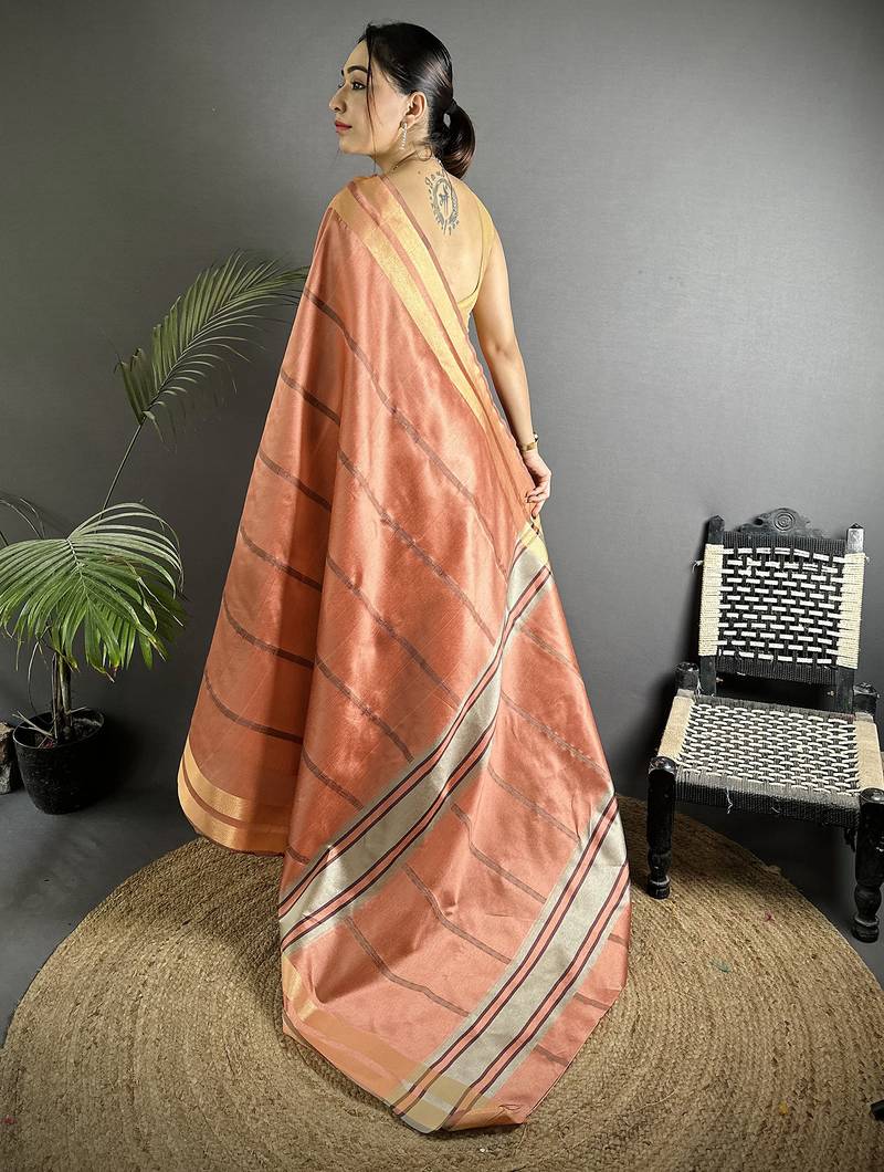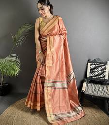 | Product Name | Peach Raw Silk Blend Zari Woven Ghicha Art Saree | |