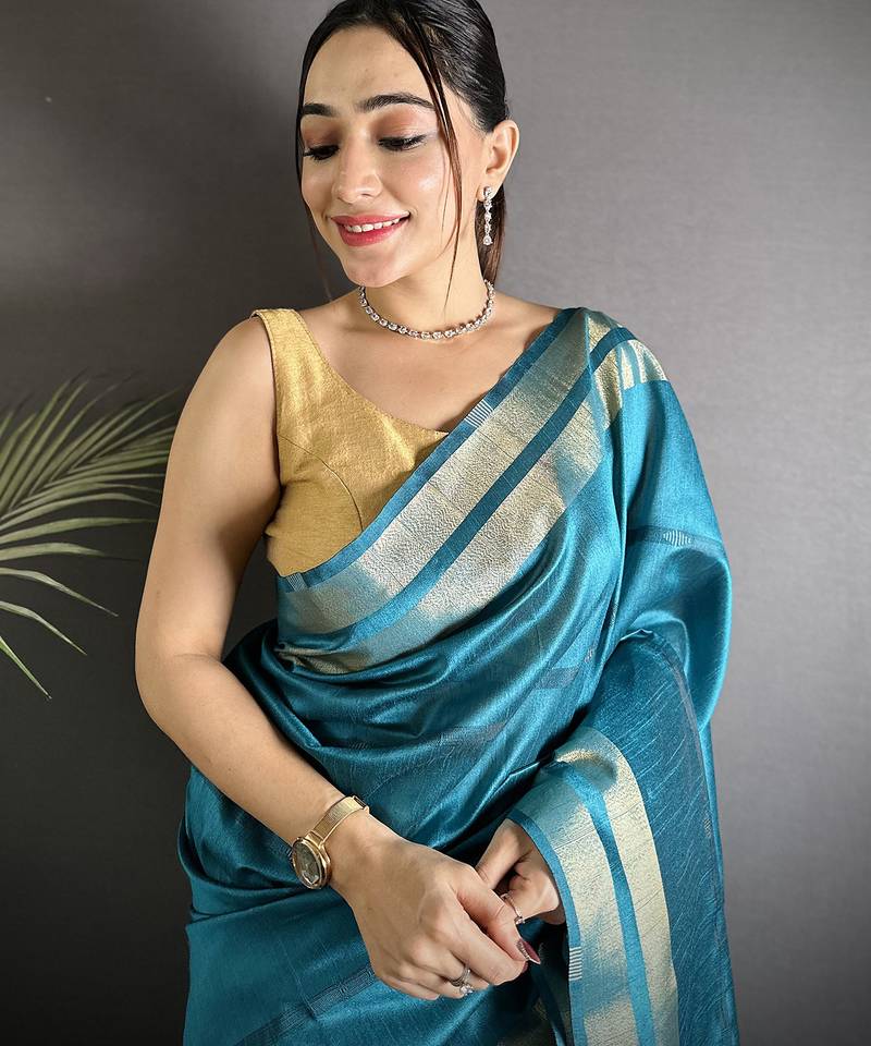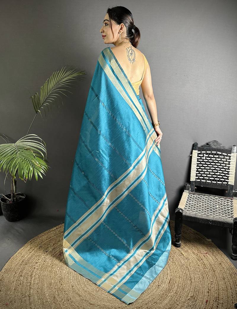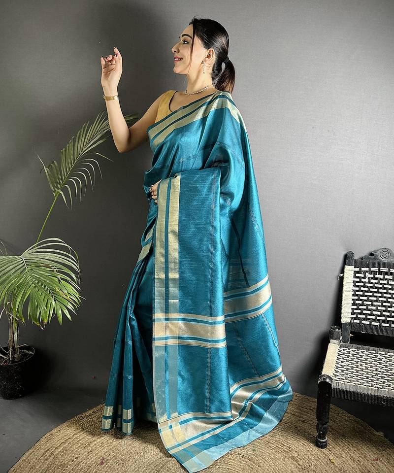 | Product Name | Turquoise Raw Silk Blend Zari Woven Ghicha Art Saree | |