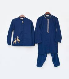 | Product Description | How Smart And Dapper Look Does This Blue Kurta Jacket And Salwar Set Look With Motifs On It. How Smartly Can You Use This With Or Without The Jacket And It Will Still Look As Smart And Dapper On Your Champ.Self Cotton Jacket With Soft Liningmotifs On One Sidebuttons On |