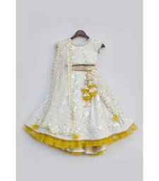 | Product Description | This Elegant Off White And Mustard Lehenga Choli Set Is A Lovely Outfit To Add To Your Angel's Wardrobe. It Comes With Embroidered Choli With Cape Sleeves, Has Finishing Lace And Tassels On The Back. It Has A Detachable Belt Which Also Has Matching Tassels On The Side. |