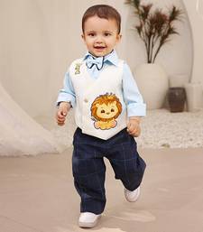 | Product Description | Dress Your Young Gentleman In Dapper Elegance With Our White Waistcoat With Pant And Shirt Set. The Set Includes A Blue Shirt With A Matching Bow Tie, Paired With A White Waistcoat Featuring Soft Lining And Charming Motifs. The Blue Check Pant Adds A Touch Of Sophistication, While The Crown Button On The Waistcoat Adds A Regal Flair. Colour : White