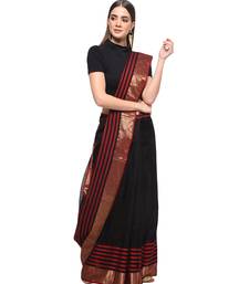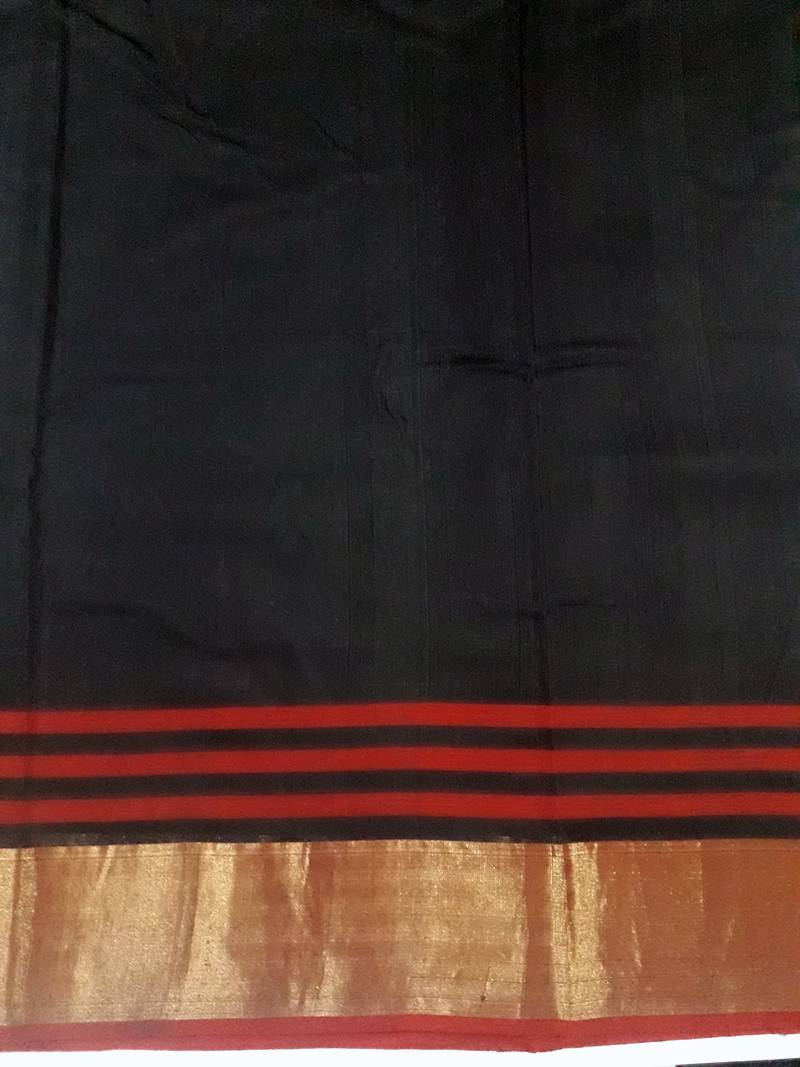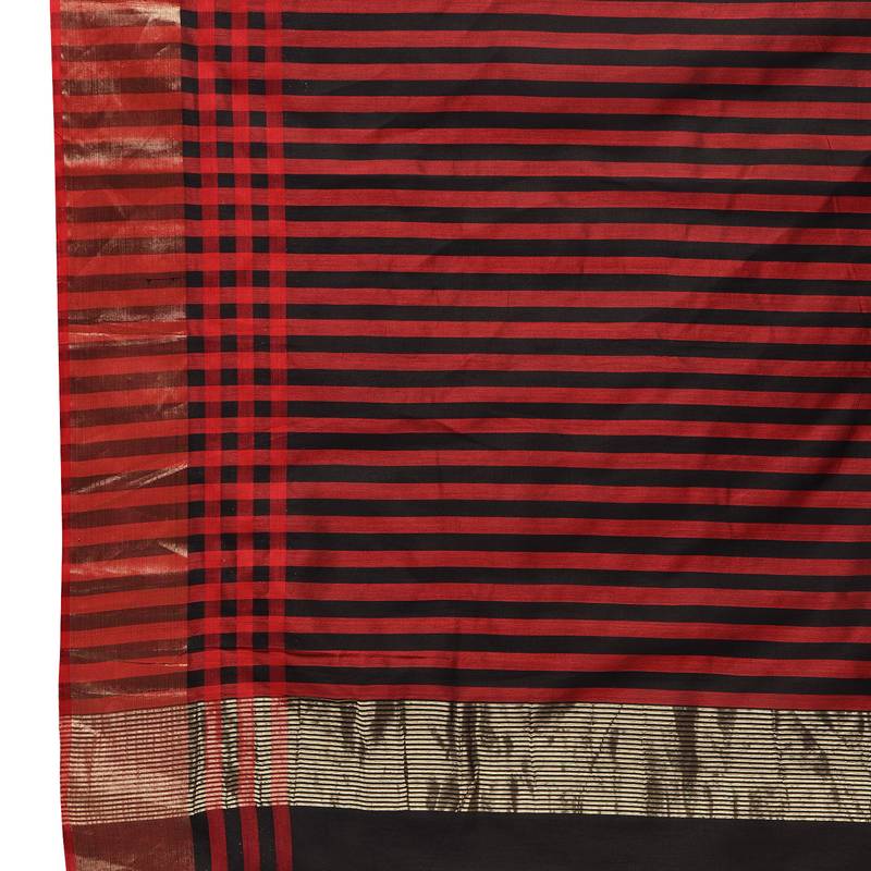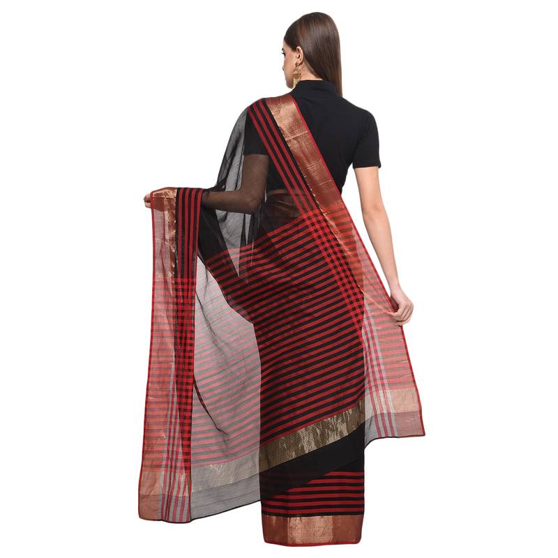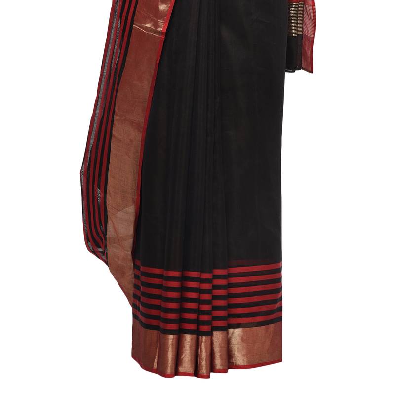 | Product Description | Fabric & Craft: Handwoven Pure Cotton Silk Blend Chanderi Saree Color & Design: Black Saree With Red Stripes, Finished With Gold Tissue Border And Pallu Occasion: Ideal For Festive Wear, Wedding Functions, Parties & Ethnic Occasions Blouse Piece: Matching Blouse Piece Included Along The Saree Length Length & Care: Total Length 6.75 Meters (Incl. Blouse) | Dry Clean Only |