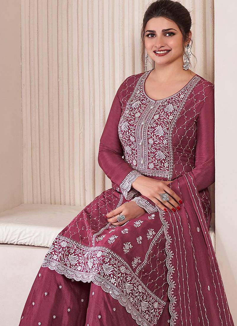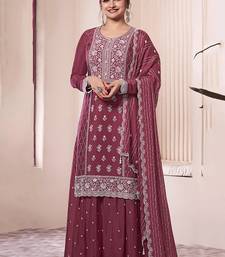 Burgundy sequin and thread embroidery palazzo suit semi stitched