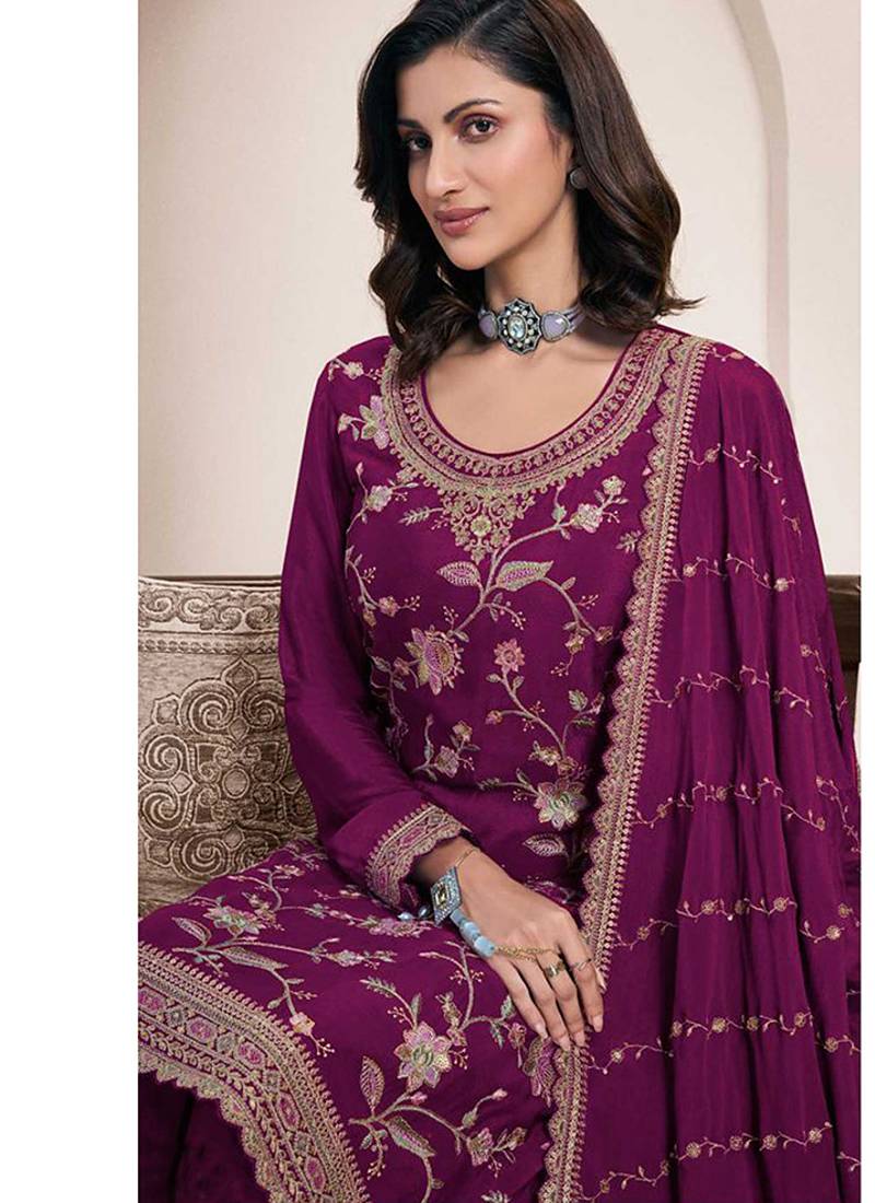 | Product Name | Dark Magenta Chinon Embroidered Sharara Suit | |
