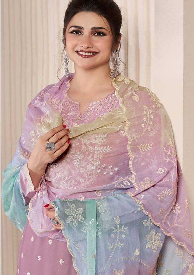 Lavender moonga silk embroideredpant style suit semi stitched