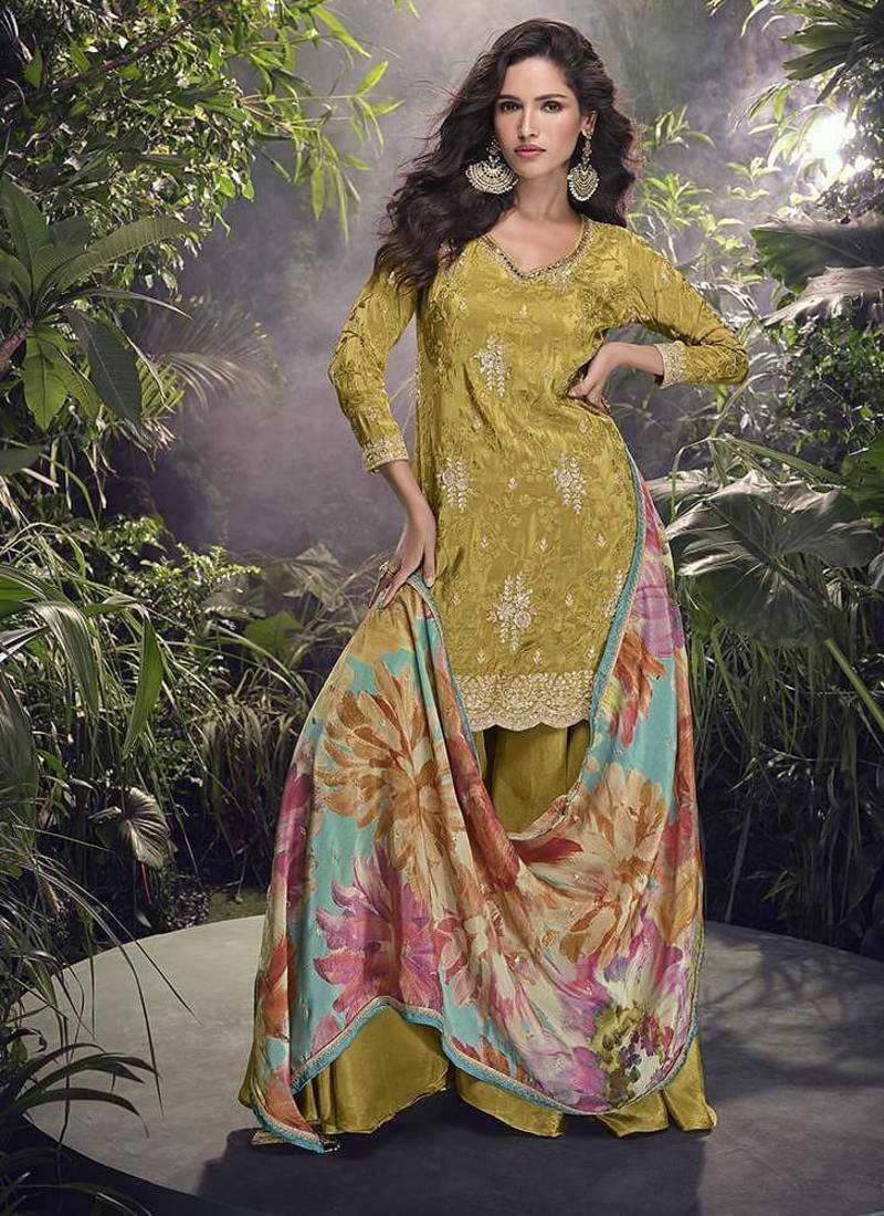 Mustard chinon silk palazzo suit semi stitched